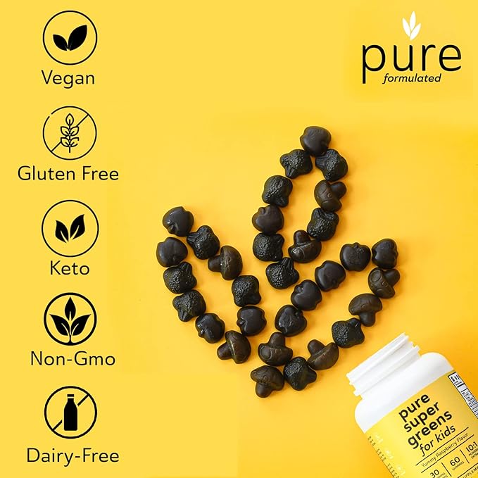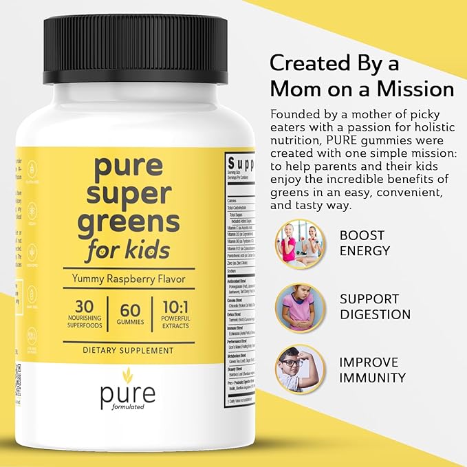 - A FUN AND EASY WAY TO GET SUPERFOODS - Don't worry about your child not eating their greens anymore. With Pure Super Greens Gummies vitamins for Kids, your child can get all the benefits of superfoods without any fuss. Our kids' multivitamin gummies are a fun and easy way to get the nutrients they need to stay healthy.