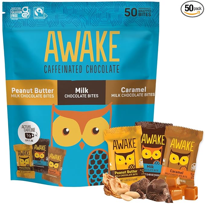AWAKE - Caffeinated Chocolate Bites - Variety Pack (3 Flavors), 50 Bites - Peanut Butter, Milk, & Caramel - 50mg Caffeine - Energy Bites - Coffee Alternative - Fairtrade, Gluten Free, Non GMO - 0.48oz