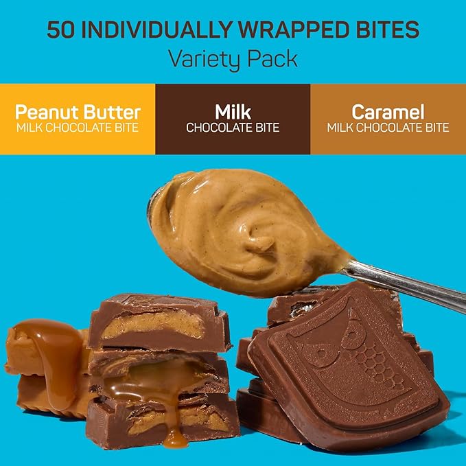 - Original Bites Variety Pack - Variety is the spice of life, friends. Put a pep in your step with a mix of our beloved Caramel, Peanut Butter, and Milk Chocolate Bites! Includes 50 individually wrapped bites made with premium fairtrade chocolate.