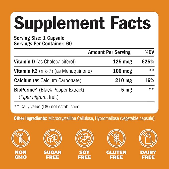 Vitamin D3, K2 Calcium Supplement with BioPerine for Immune & Bone Health - Vitamin D 5000 IU + Vitamin K2 as MK7 + Calcium. 4 in 1 Support: Strong Bones & Teeth Plus Joint & Heart Health. 60 Capsules