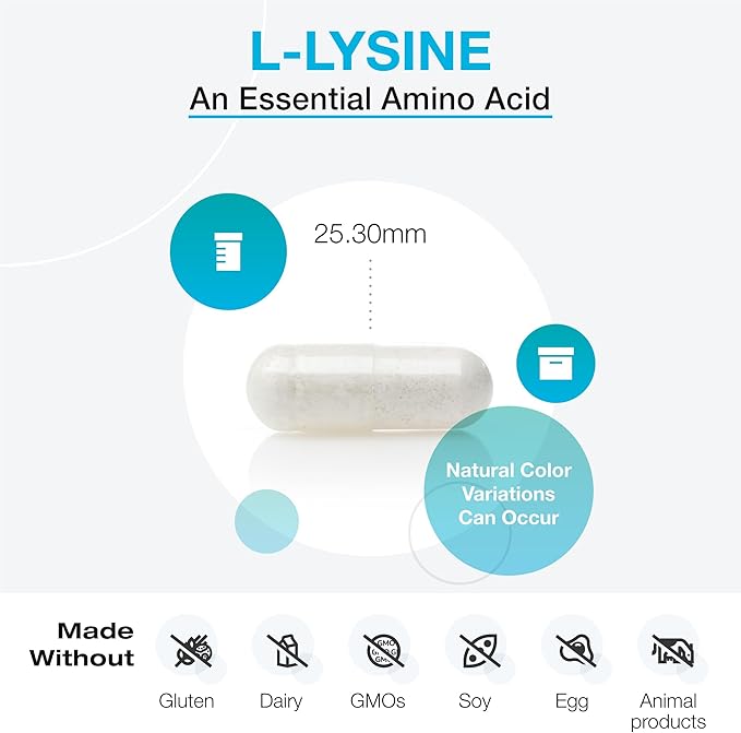 - Contains 500mg l-lysine per capsule.