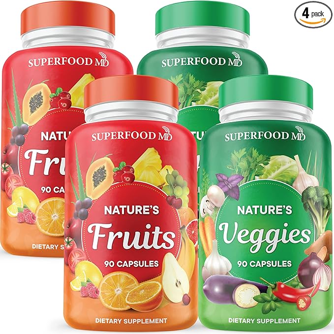 Superfood 180 Fruit and 180 Veggie Capsules -100% Whole Natural Superfood - Maintain Energy Levels, High Lycopene - Grown and Made in The USA (90 Count (Pack of 4)