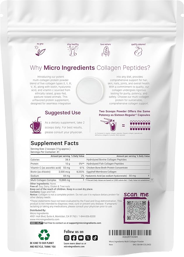 - Micro Ingredients 8 in 1 full spectrum hydrolyzed collagen peptides powder. The ultimate anti-aging complex that offers up to 11g of pure pasture raised collagen peptides per serving. Created with premium hydrolyzed collagen for complete and efficient absorption that nourishes the hair, skin, nails, and joints.