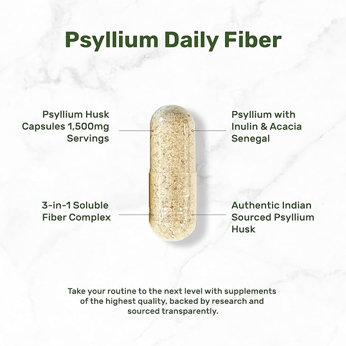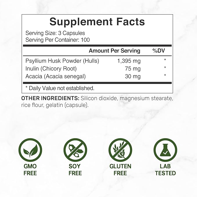 - Supply & Servings – 300 capsules per bottle, 3 capsules per serving, 100-day supply, 1,500mg complex from 1,395mg of Psyllium Husk Hulls, 75mg of Chicory Root Inulin, and 30mg of Acacia Senegal.
