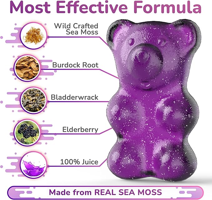- UPERIOR SUPERFOOD GOODNESS: Give your body a nutritious delight with TrueSeaMoss Seamoss Gummies Bears. The chewables are made with 1200 mg of Irish Sea Moss, 130 mg Burdock Root, and 400 mg Bladderwrack, Elderberry Extract