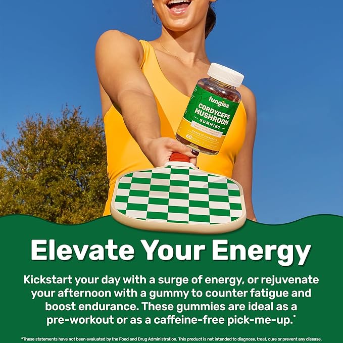- ELEVATE YOUR ENERGY — Discover the power of Fungies Cordyceps Mushroom Gummies for a natural energy boost. Crafted with Cordyceps militaris extract, these super mushroom gummies are a caffeine-free way to elevate your energy levels. Perfect for when extra vitality is needed, each mushroom gummy is a daily dose of performance mushrooms energy, enhancing alertness and focus without caffeine jitters. Ideal for demanding tasks or active lifestyles to keep you alert and sharp.*