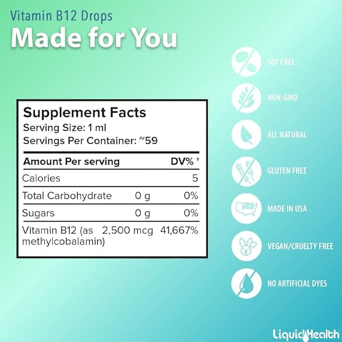 - MAXIMIZE YOUR NATURAL ENERGY: Liquid Health's Vitamin B12 Drops contain 2500 mcg of Methylcobalamin, an easy-to-absorb form of Vitamin B12. These essential liquid B-supplement drops help to enhance your body's natural energy levels to fight fatigue and weakness, giving you a sustained energy boost throughout the day!