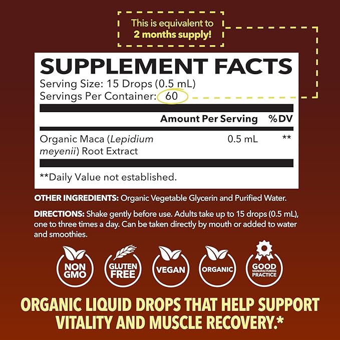 - Organic Maca Root Extract Liquid: Our Maca Root Liquid Extract is certified organic, ensuring the highest quality. It's derived from pure maca root, extracted in a form that maximizes performance.