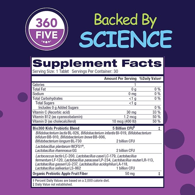 - GREAT-TASTING CHEWABLES IN BLISTER PACK : Bio360 Kids mixed berry flavored chewable tablet is the best tasting daily probiotic your kids will love. They are made with clean natural ingredients with no artificial flavor, color or preservative, no added sugar, syrup or corn starch