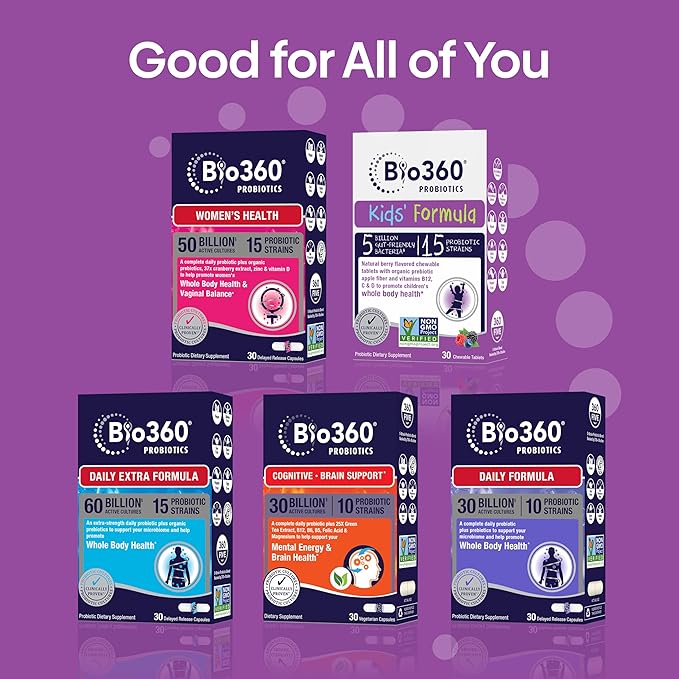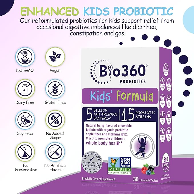 - TRUSTED BY MOMS: Each Kids chewable probiotic is individually sealed in a shelf stable blister pack for protection. Bio360 Supplements are Natural, Non-GMO Project Verified, Vegan friendly & Free of Dairy, Gluten, Egg, Peanut & Soy