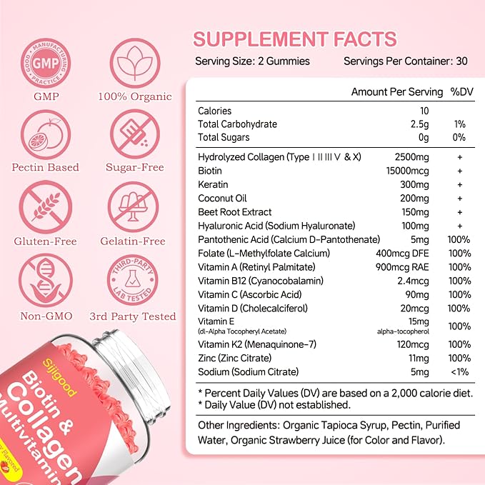- 16 in 1 Premium Formula: Our per serving collagen biotin gummies are made from 2500mg collagen, 15000mcg biotin, 300mg keratin, 200mg coconut oil, 150mg Beet Root Extract and rich in vitamins and minerals: hyaluronic acid, pantothenic acid, folate, Vitamin A, B12, C, D, E, K2, zinc and sodium to keep you radiant and beautiful from the inside out and maintain overall health