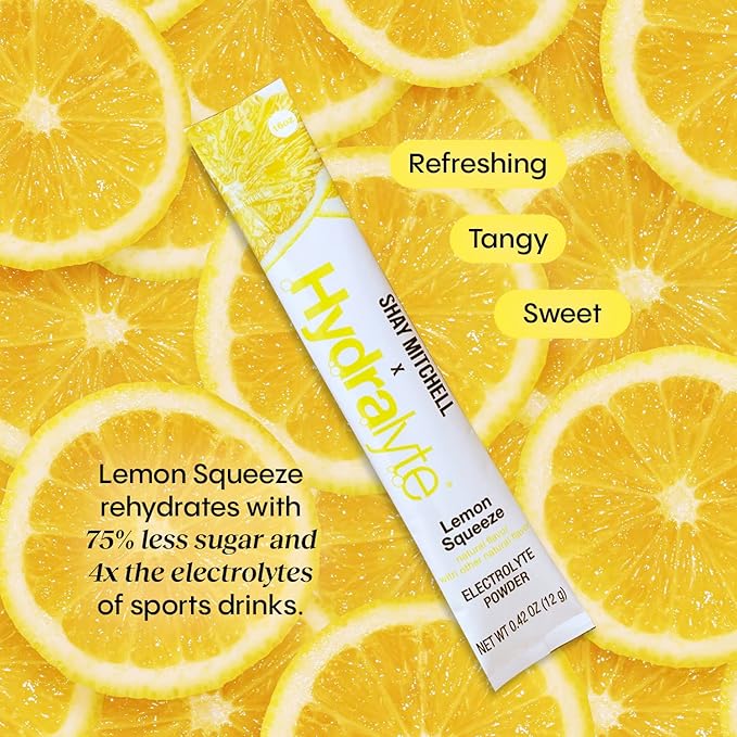Hydralyte Shay Mitchell Low Sugar Rapid Rehydration - Lightly Sparkling Electrolyte Powder Packets, Lemon Squeeze | Travel Essential - Workout Essential - Recovery Powder (18 Count)