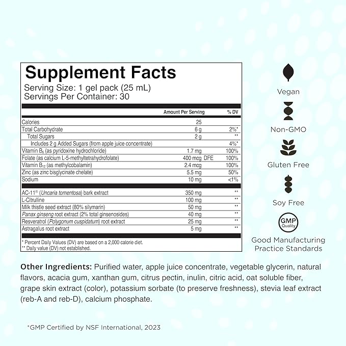 - Replaces 7 Pills: Over 587 mg of telomere maintaining nutrients in one gel pack, including ginseng extract, B vitamins, zinc, AC-11 and L-citrulline. To get the same effective doses of these nutrients, you would need to swallow over 7 large capsules