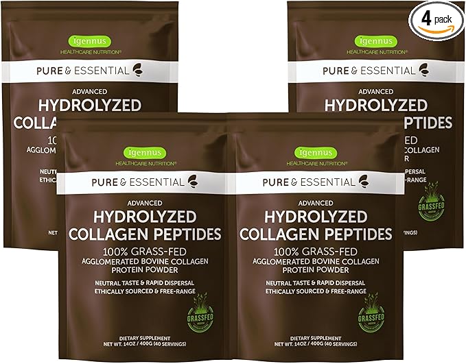 100% Grass Fed Bovine Collagen Protein Powder, Collagen Types 1, 2 & 3, Advanced Hydrolyzed Collagen Peptides, Non-GMO, Free Range, Gluten & Dairy Free, Easy Mix, 4 x 40 Servings, Pure & Essential