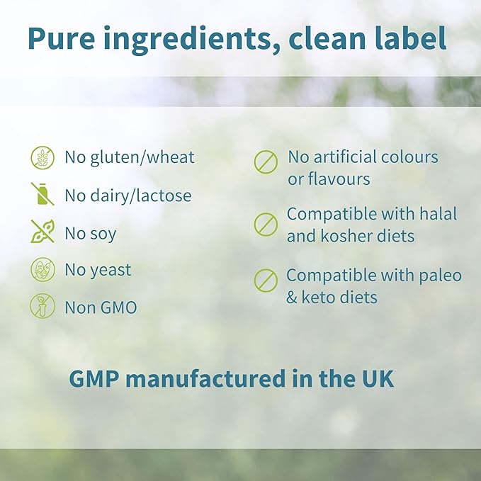 - UK GMP MANUFACTURED. Free from gluten, dairy, lactose, soya, wheat, artificial colors & flavors; non-GMO; kosher. Paleo & keto-compatible. 100% recyclable packaging.