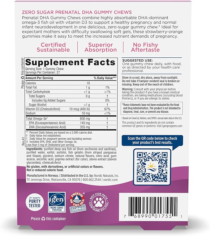 Nordic Naturals Zero Sugar DHA Prenatal Vitamin Gummies, Strawberry Orange Flavor - 27 Gummies - Supplements for Pregnancy - 600 mg Omega-3 Fish Oil and 400 IU Vitamin D3-27 Servings