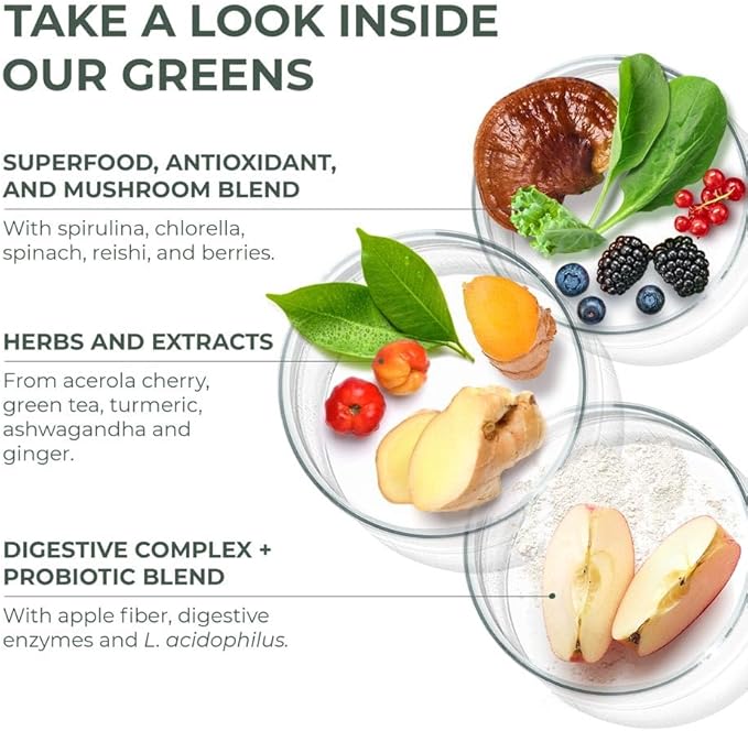 - A Supergreens, Antioxidant and Adaptogenic Blend: Featuring blueberries, strawberries, cherries, ashwagandha, maitake, reishi mushrooms and so much more to help support energy and overall wellness