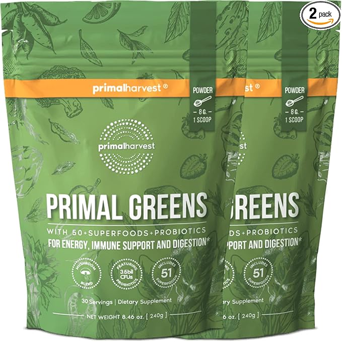 2 Pack, Super Greens Powder, 30 Servings w/+50 Greens Superfood Chlorella, Probiotics, Green Tea, Wheatgrass, Kale, Turmeric, Green Superfood Powder for Energy - Primal Greens