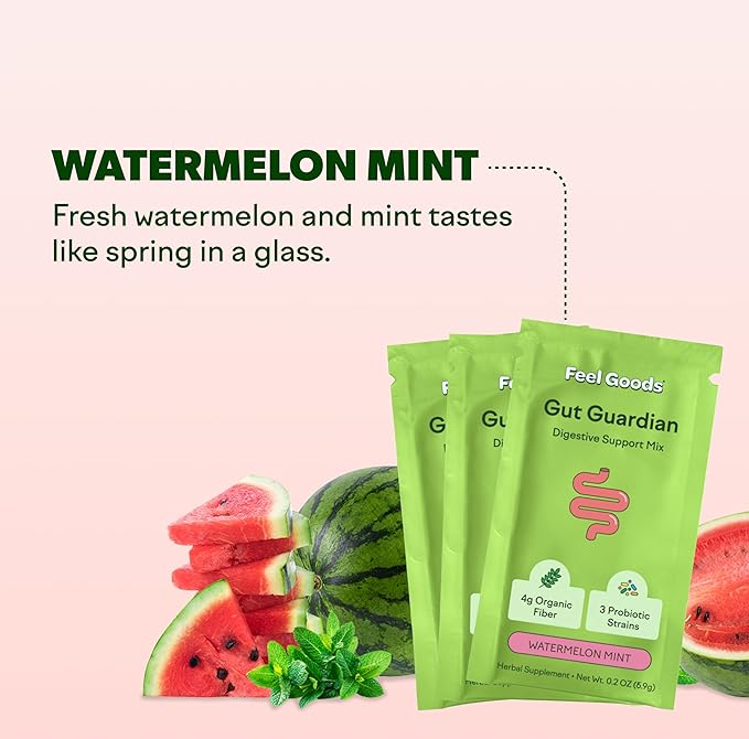 Feel Goods Gut Guardian, Prebiotic & Probiotic Powder, Organic Fiber, Sugar Free, Herbs for Bloat, Gut Health Support, Digestive Health for Men & Women, Non GMO, Vegan | Watermelon Mint, 15 Count