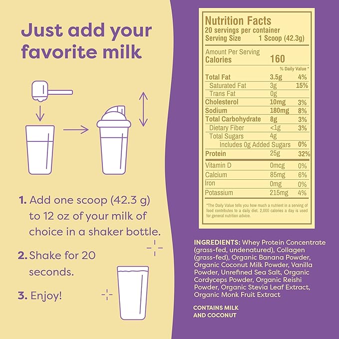 - TOTAL BODY NOURISHMENT: Formulated with non-GMO, minimally processed, and grass-fed, undenatured whey protein, collagen, and added amino acids. Grass-fed bovine collagen peptides (10g per serving) provide extra protein and joint support. Reishi and Cordyceps mushrooms can help increase focus and cognition.