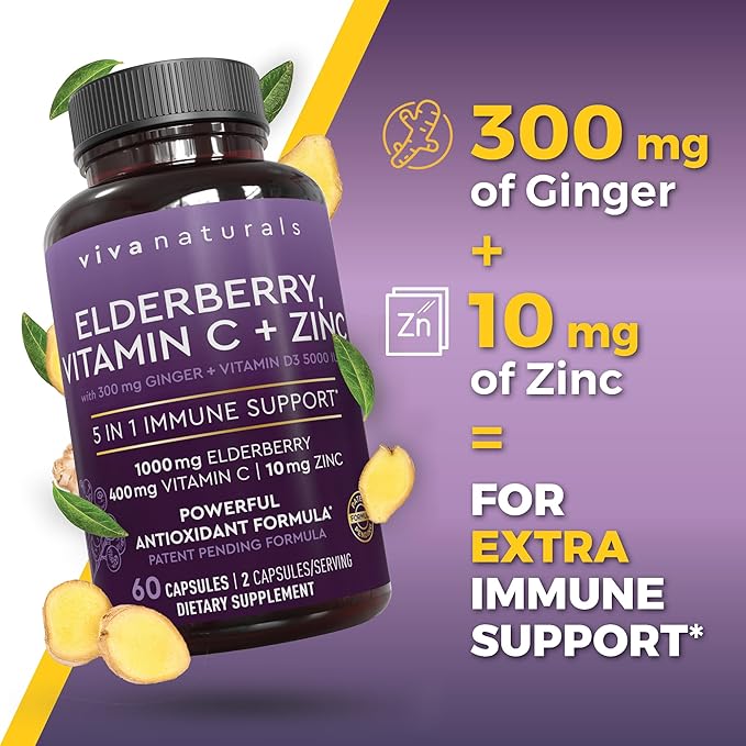 Viva Naturals Sambucus Elderberry with Zinc and Vitamin C for Adults, Vitamin D 5000 IU and Ginger - Immune Support Supplement, 60 Count - Black Dried Elderberry Capsules for Adults