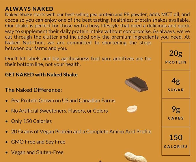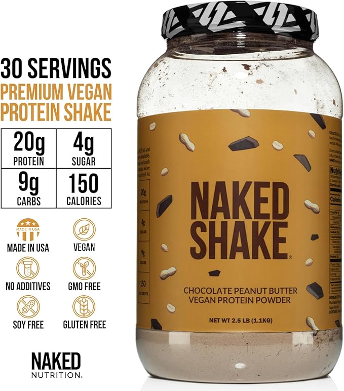 - PREMIUM CHOCOLATE PB PROTEIN SHAKES: Use Naked Shake to supplement your protein intake without compromising on quality. Just mix our natural chocolate peanut butter powder with water and enjoy a tasty protein shake while you’re on the go.