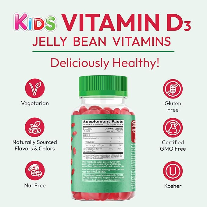 - VITAMIN D JELLY BEANS FOR CHILDREN The best way for kids to take daily supplements. Our Vitamin D jelly beans are an easy, enjoyable way to enrich your child's nutritional intake, with a delicious Strawberry Blast flavor and unique chewable jelly bean texture.