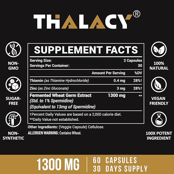 - Non-Synthetic Ingredients : Thalacy cares more about your overall wellness, and the solvent-less, all-natural extraction method. Without any synthetic spermidine form in our product. Each serving contains 1300 mg of a highly concentrated form of fermented wheat germ extract (Contains 13 mg of Spermidine), zinc, and vitamin B1