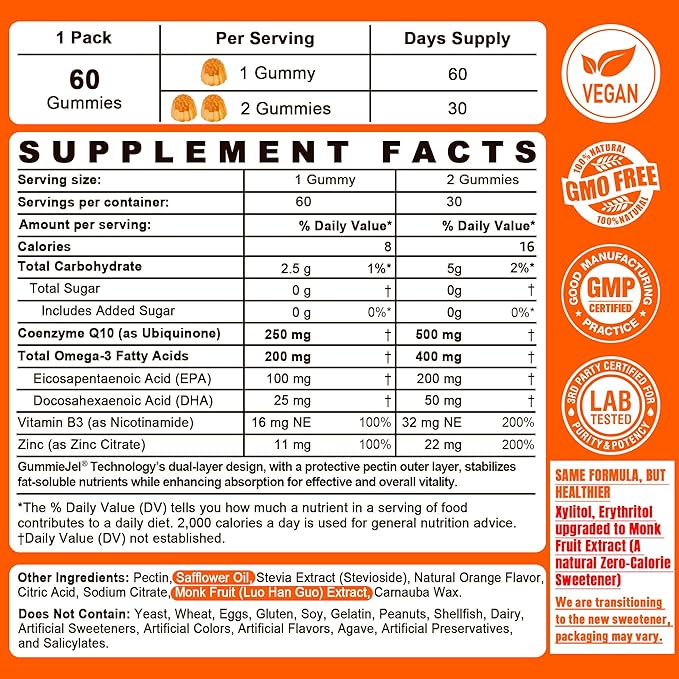 Sugar-Free CoQ10-250mg / 500mg Filled Gummies - Plus Omega-3, EPA + DHA, B3 & Zinc - Ultra Co Q-10 Supplements for Hear-t Health, Cellular Energy, Antioxidant Support, Up to 60 Day Supply, Vegan 60Cts