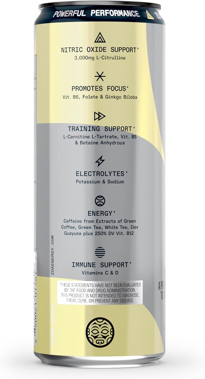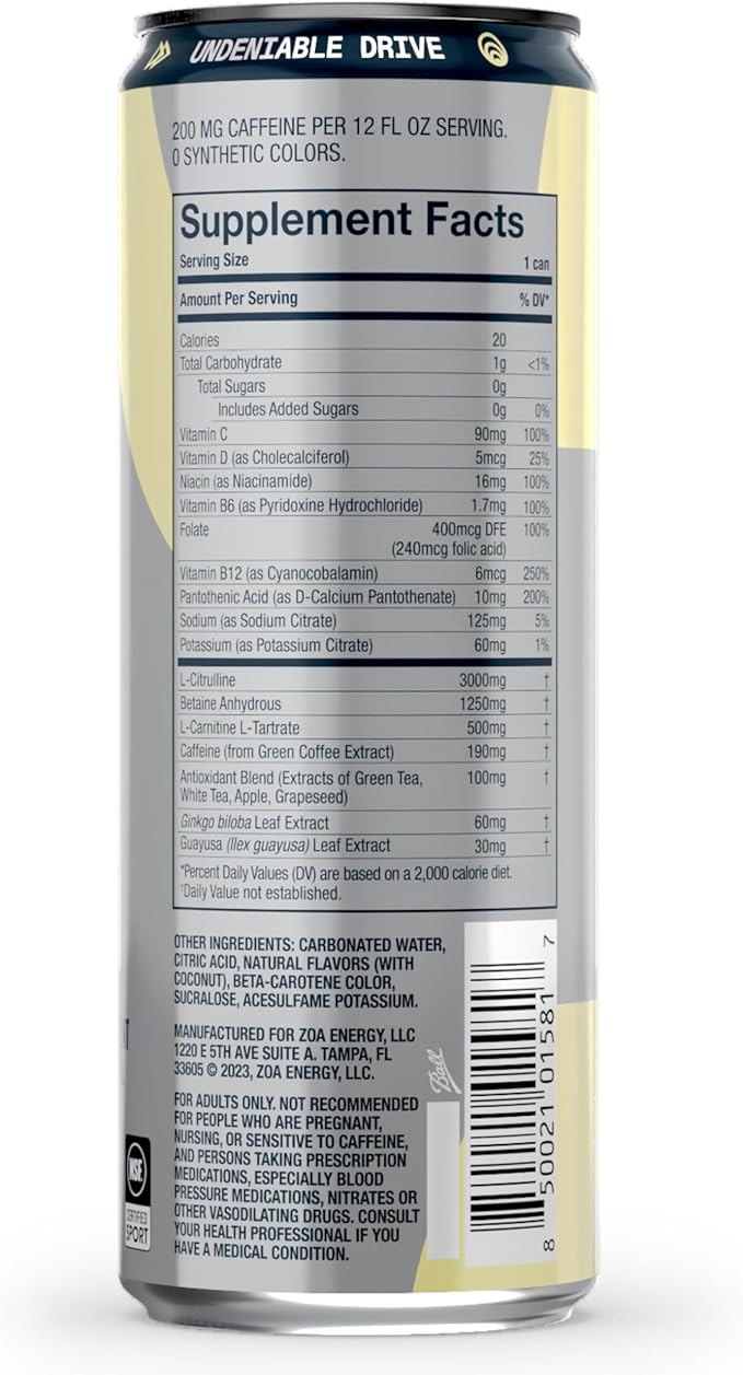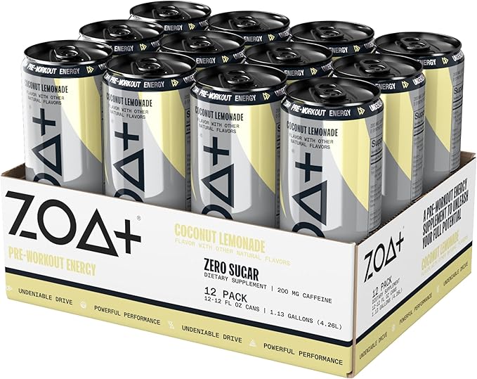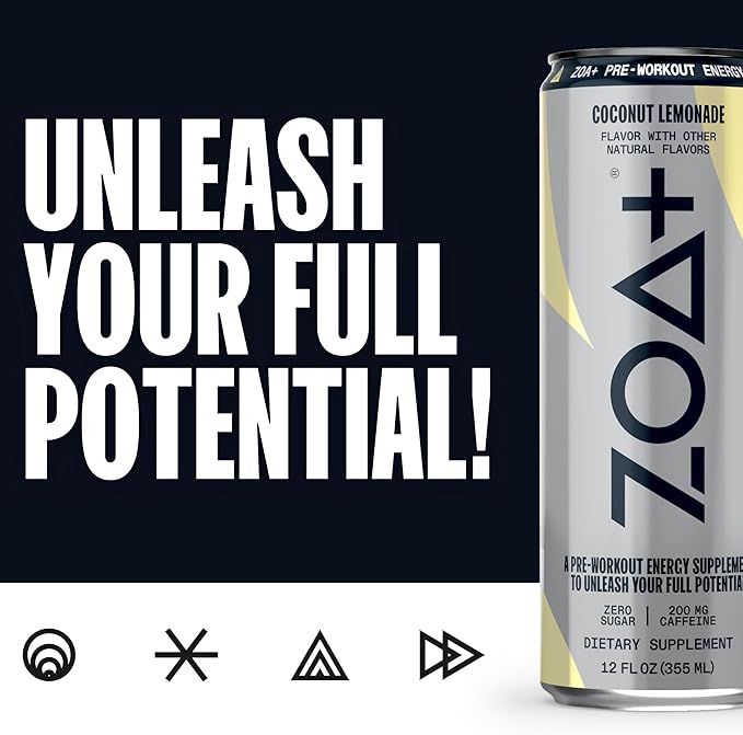 ZOA+ Pre-Workout Energy Drink Supplement - NSF Certified for Sport with Zero Sugar, Nitric Oxide Support, B & D Vitamins, Amino Acids, and Electrolytes (Coconut Lemonade)