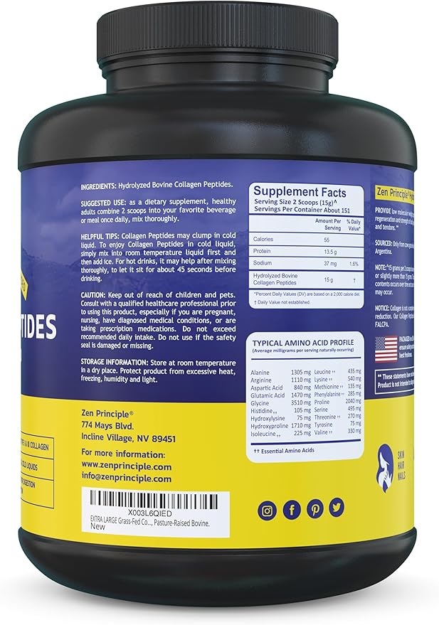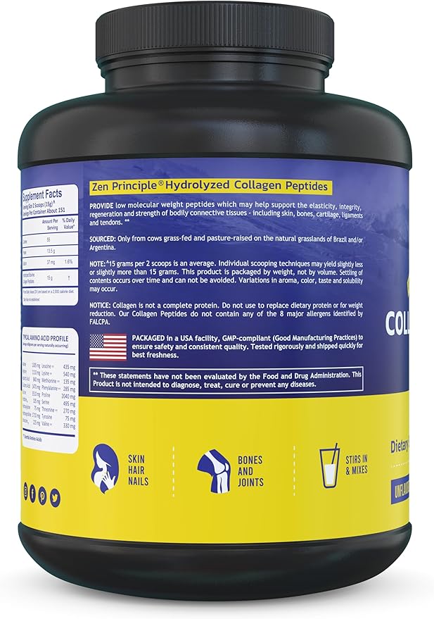 Zen Principle Grass-Fed Collagen Peptides 5 lb. Custom Anti-Aging Hydrolyzed Protein Powder for Healthy Hair, Skin, Joints & Nails. Paleo and Keto Friendly, GMO and Gluten Free, Pasture-Raised Bovine.