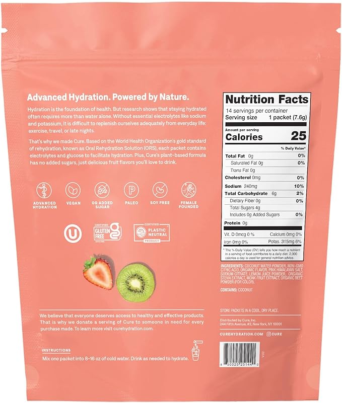 Cure Hydration | Plant-Based Electrolyte Drink Mix | No Added Sugar | FSA & HSA | Dehydration Relief Powder Made with Coconut Water | Non-GMO | Vegan | Pouch of 14 Packets - Strawberry Kiwi