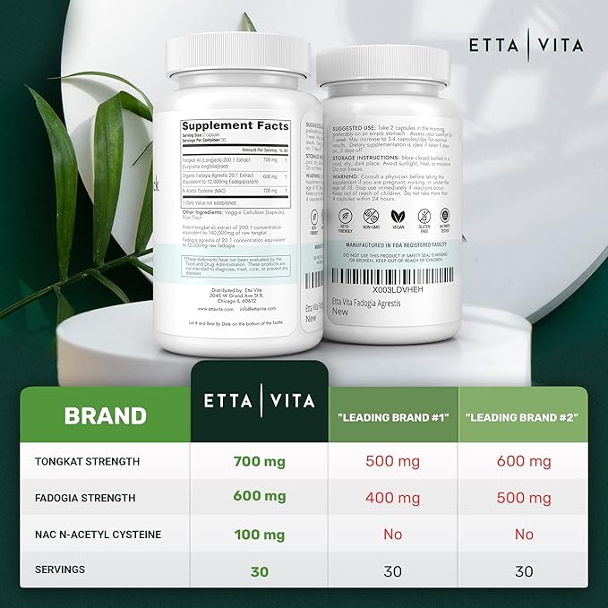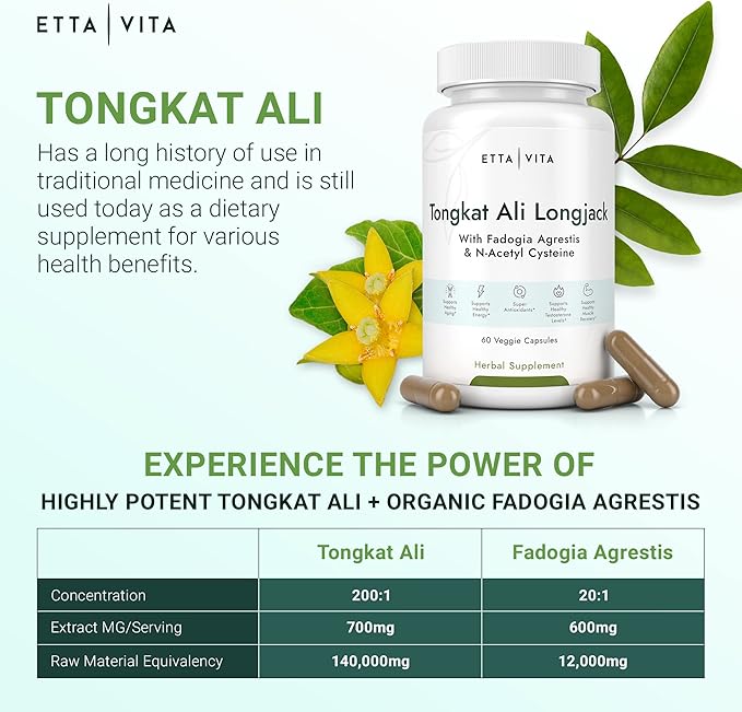 - [2x Purity - Fadogia Agrestis 20:1]: Etta Vita's tongat-ali 700mg with fadogia agrestis 600mg supplement is carefully formulated to support overall well-being and vitality. While the market standard is 1:1 – 10:1, ours is 20:1, lending more impact on hormonal balance stimulation.