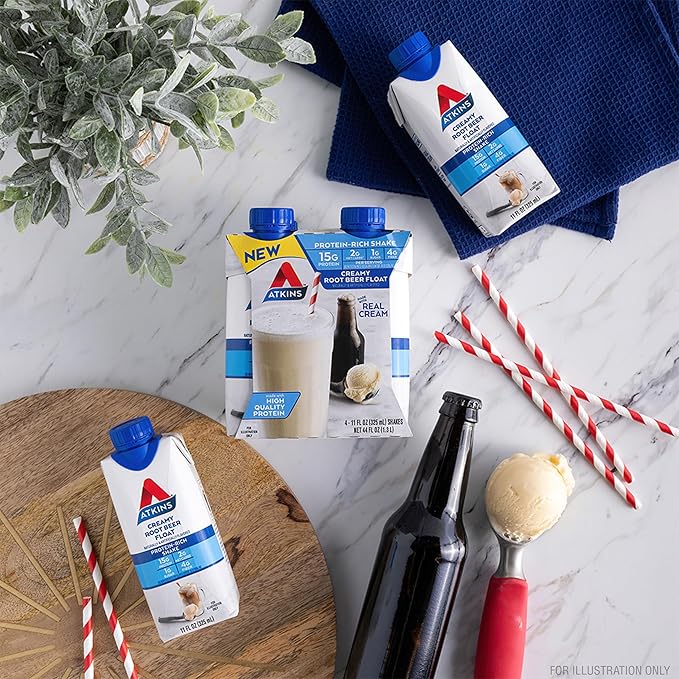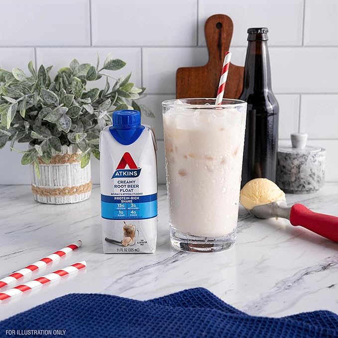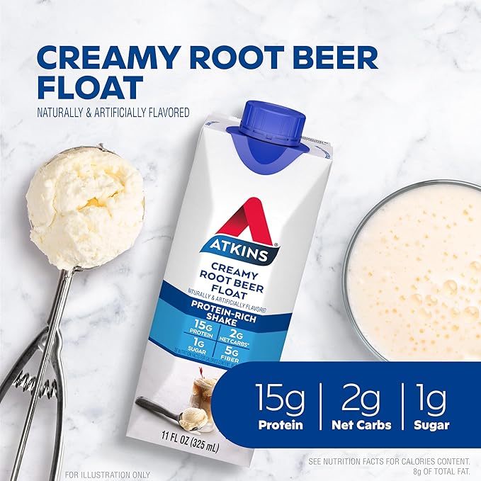 - AT HOME OR ON-THE-GO. Atkins Creamy Root Beer flavored Protein-Rich Shakes. Enjoy delicious shakes that fit right into your busy schedule, with 15g of protein, 2g of net carbs, and 1g of sugar. This is Today’s Atkins.