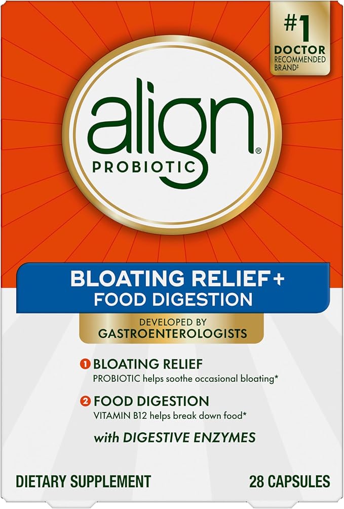 - WELL-STUDIED STRAIN: Align Probiotic Bloating Relief + Food Digestion contains the unique strain Bifidobacterium 35624 TM, which was developed by gastroenterologists, and helps soothe occasional bloating, gas, and abdominal discomfort.*