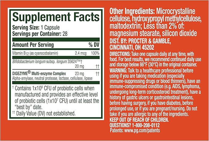 - TRY ALIGN BLOATING RELIEF + FOOD DIGESTION: Just one capsule contains good bacteria to help relieve occasional bloating*. Vitamin B12 helps promote the breakdown of food*. Each capsule also includes a complementary, proprietary blend of 5 digestive enzymes