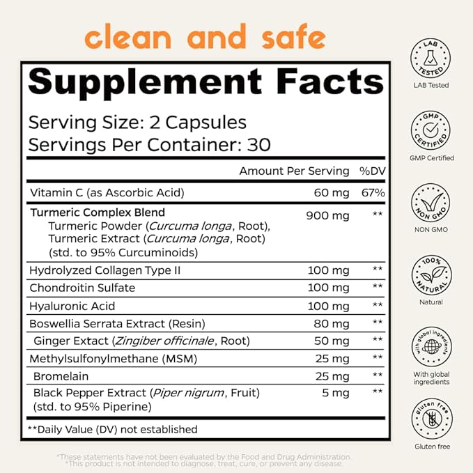 Chondroitin Boswellia MSM Turmeric Hydrolyzed Collagen - Joint Support Supplement, helps with joint mobility & flexibility, function & comfort, cartilage repair, supports smooth movement (60Ct/30Day)