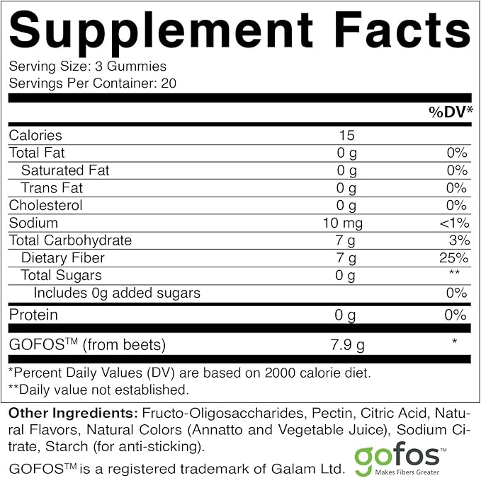 - PLANT BASED FIBER - Our gummies are made with high quality FOS (FructoOligosaccharides) from Beet.