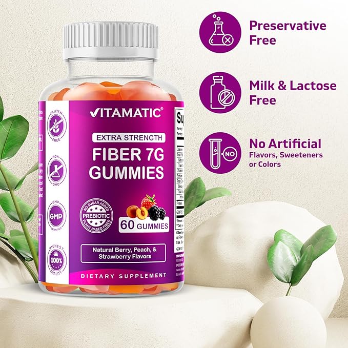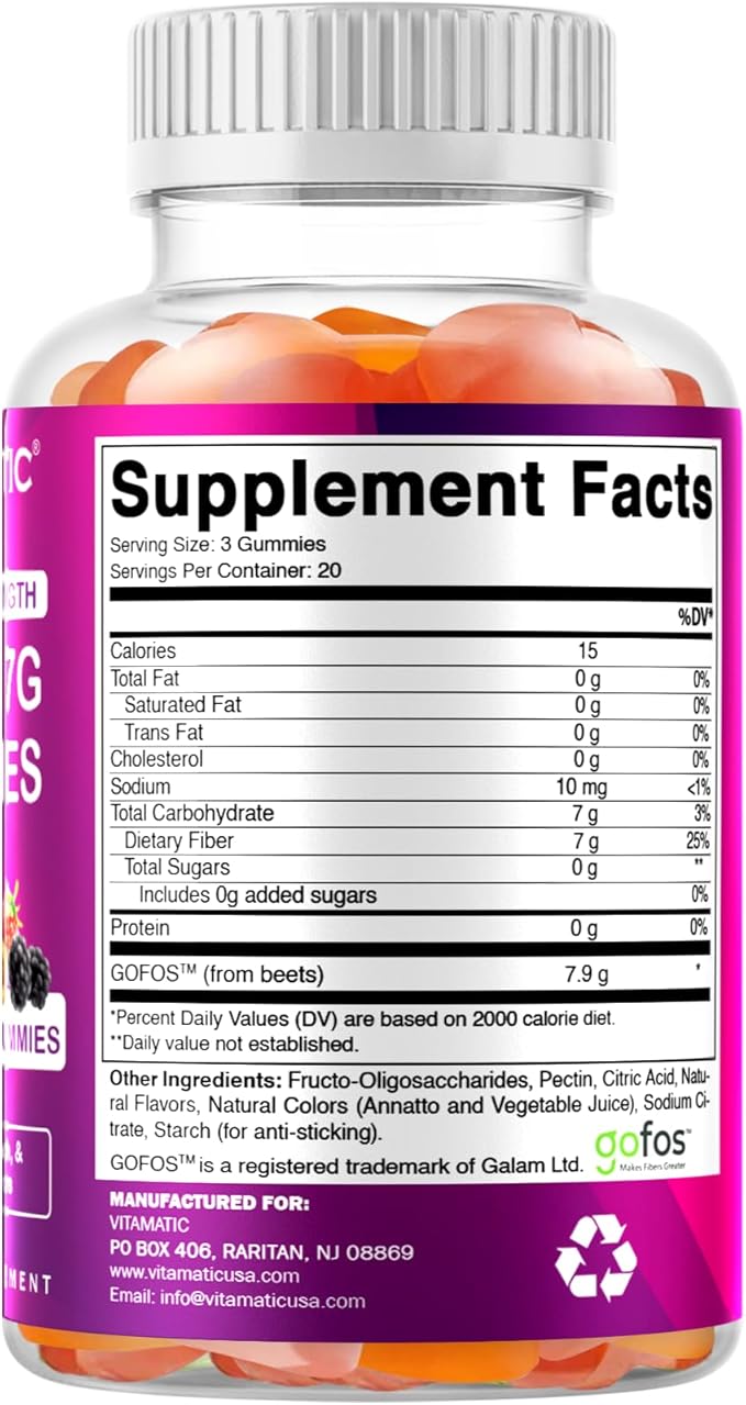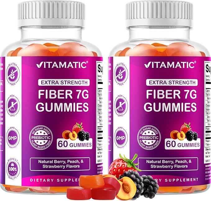 Vitamatic 2 Pack Prebiotic Fiber Gummies for Adults - 7G Fiber Extra Strength - Zero Sugar Added - 60 Pectin Based Gummies - Digestive Health & Regularity Support, (Total 120 Count)
