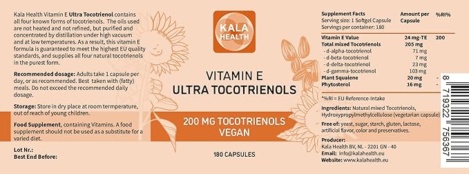 KALA HEALTH Ultra Tocotrienol 200mg Vitamin E Vegan – All 4 tocotrienols - Tocopherol Free - Supports Immune Health & Antioxidant Health Tocotrienols Supplement