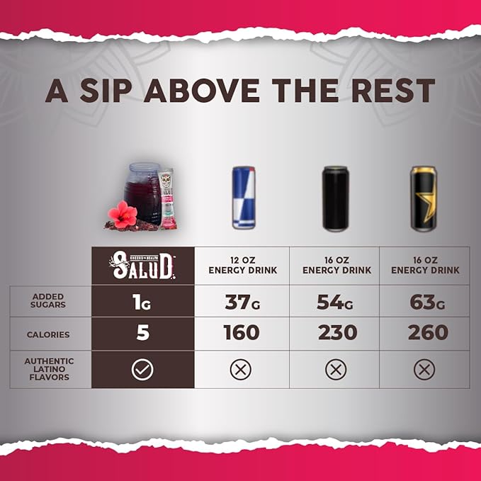 - US vs THEM - Unlike traditional energy drinks loaded with sugars, Salud will turn plain water into a mouth-watering Agua Fresca drink with only 1g of added sugar and 5 calories per serving. You can feel good about starting your mornings and workouts with Salud!