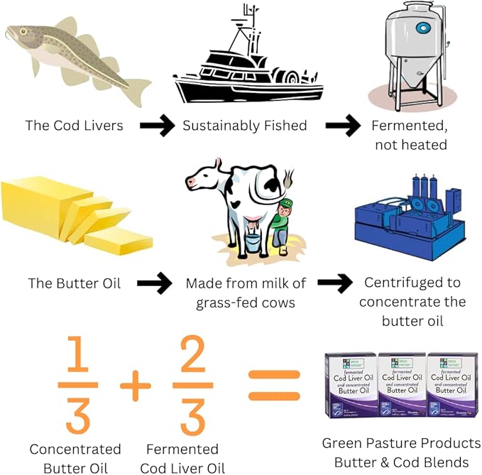 - Green Pasture fermented cod liver oil butter blend is a source of Omega-3, Omega-6 and Omega-9 as well as Vitamin A & Vitamin D that are naturally occurring and benefits the whole family.