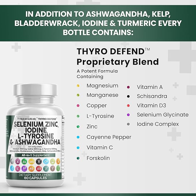 - The Ultimate Thyroid Complex & Iodine Supplement You've Been Looking For - Clean Nutra ThyroDefend provides 5 full-dose products in one thyroid support complex containing a full zinc supplement, iodine supplements for thyroid, selenium supplements, tyrosine powder, and ashwagandha supplements in a convenient 2 capsule dosage. Finally, iodine pills, zinc 50 mg and an ashwagandha supplement have been packed into one convenient solution.