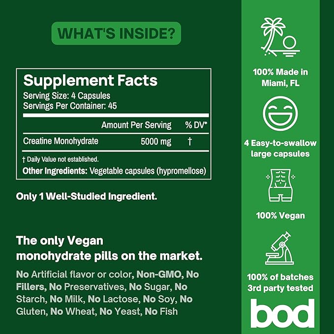 - EASY-TO-SWALLOW VEGAN CAPSULES: Each serving of BOD’s Creatine Monohydrate Pills includes 4 easy-to-swallow capsules, perfect for pre or post-workout. No more dealing with gritty powders or bulky tablets. Convenient to take on-the-go, just leave them in your gym bag.