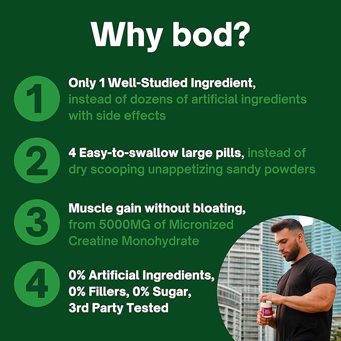 - PERFECT FOR HEALTH-CONSCIOUS ATHLETES: BOD’s Creatine Monohydrate Pills are vegan, free of artificial flavors, colors, and fillers. Manufactured in an NSF-Certified facility in the USA, ensuring the highest quality and purity. Suitable for those following vegan and keto lifestyles.