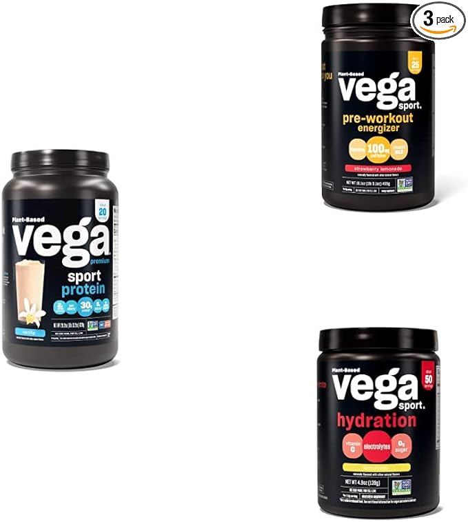 Vega Sport Routine Bundle - Premium Vanilla Protein Powder (20 Servings) Strawberry Lemonade Preworkout Energizer (25 Servings) and Lemonade Electrolyte Hydration (50 Servings)