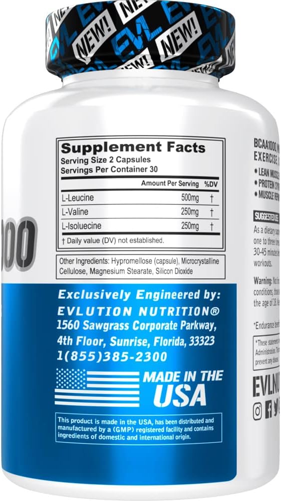 BCAAs Amino Acids Supplement for Men - EVL 2:1:1 5g BCAA Capsules for Post Workout Recovery and Lean Muscle Builder for Men - BCAA1000 Branched Chain Amino Acids Nutritional Supplement - 30 Servings