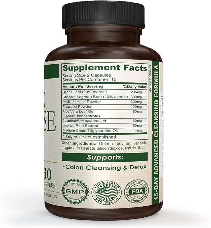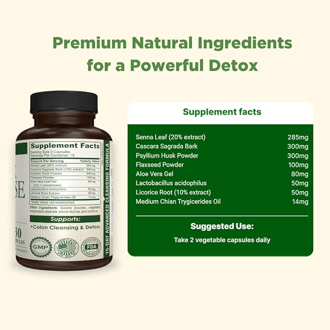 - NATURAL INGREDIENTS - Our Detox Cleanse is formulated with herbs known for their cleansing properties. These vegetable capsules effectively promote regularity, featuring Senna Leaf, Cascara Sagrada Bark, Psyllium Husk Powder, Flaxseed Powder, and more.
