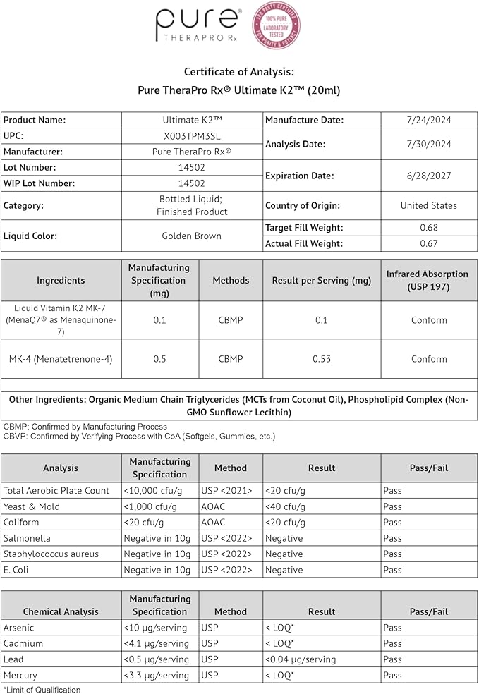 - ππππππππ πππππππ π ππ πππππ-ππππ ππππππ: Pure TheraPro Rx Ultimate K2 is a comprehensive supplement that contributes to your overall well-being. Formulated with essential Vitamin K2, this liquid multivitamin promotes normal blood coagulation, cardiovascular health, and bone strength & density. Additionally, it supports healthy skin, strong hair, brain function, and hormone balance. Elevate your holistic wellness with this vegan-friendly and complete supplement.