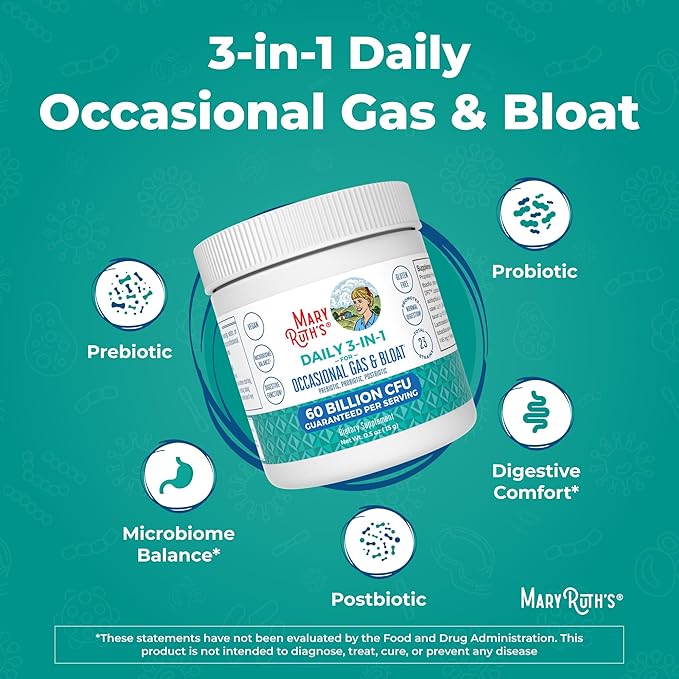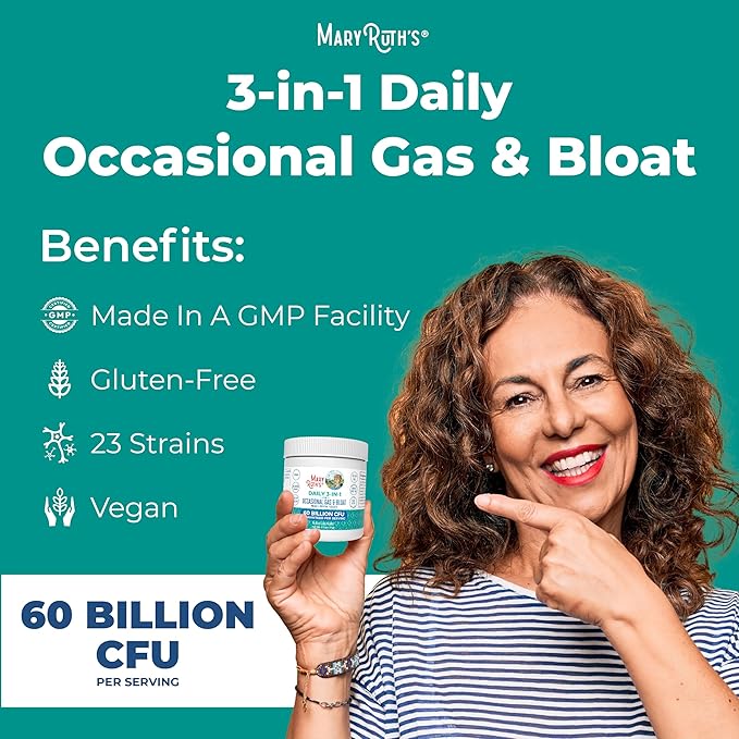 - For Most Lifestyles: MaryRuth's Daily 3-in-1 for Occasional Gas & Bloat is Vegan, Non-GMO. Dairy Free, Nut Free, Gluten Free, Soy Free, Sugar Free, Shelf Stable. Made in a GMP Facility. Clean Label Project Certified. B Corp Certified.